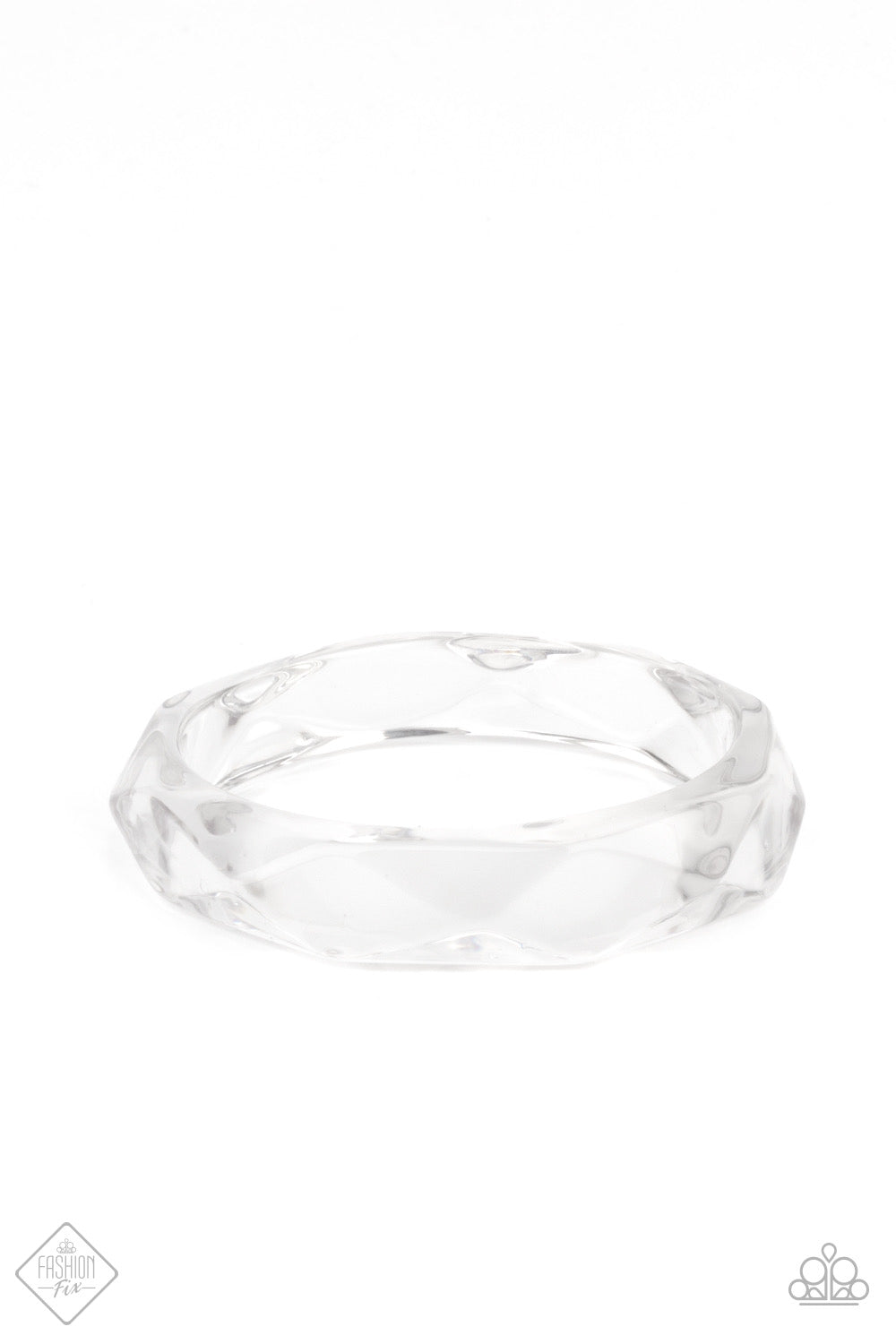 Featuring a flashy faceted surface, an oversized crystal-like acrylic bangle glides along the wrist, casting rainbow reflections with its glassy exterior