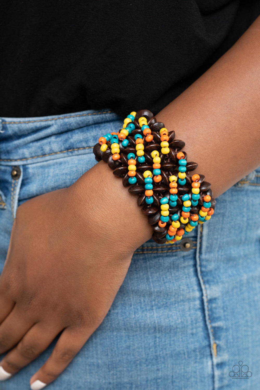 A collection of dainty blue, orange, and yellow wooden beads and brown wooden discs are threaded along knotted stretchy bands, creating a tropical floral pattern around the wrist.