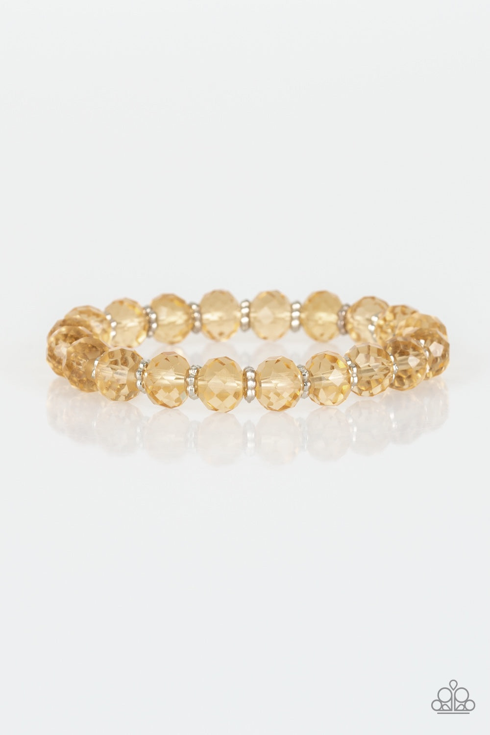 Glittery crystal-like beads and studded silver rings are threaded along a stretchy band around the wrist for a sophisticated look.
