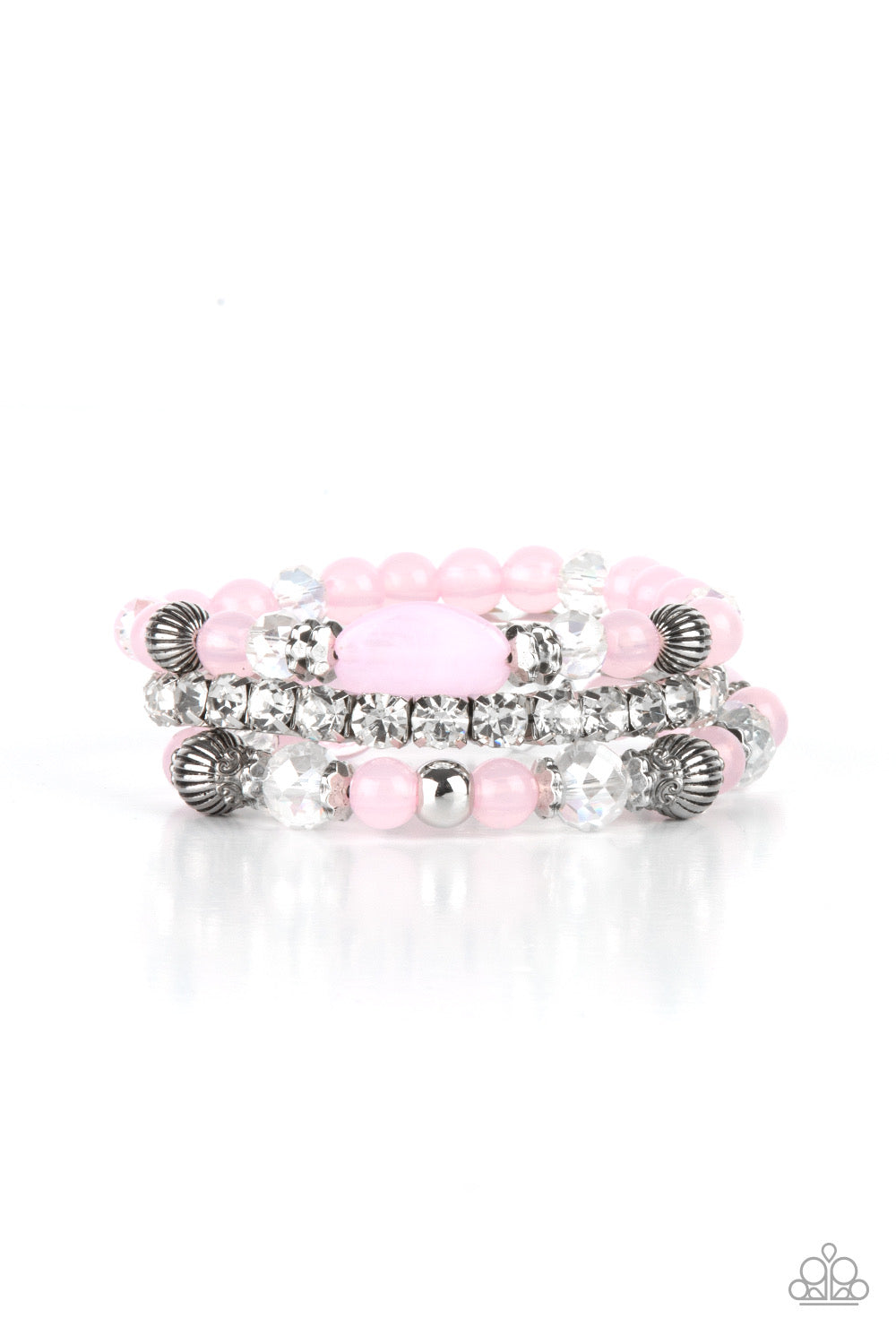 Infused with a stretchy strand of glassy white rhinestones, a mismatched collection of cloudy pink, white crystal-like, and ornate silver accents are threaded along stretchy bands around the wrist, creating ethereal layers.