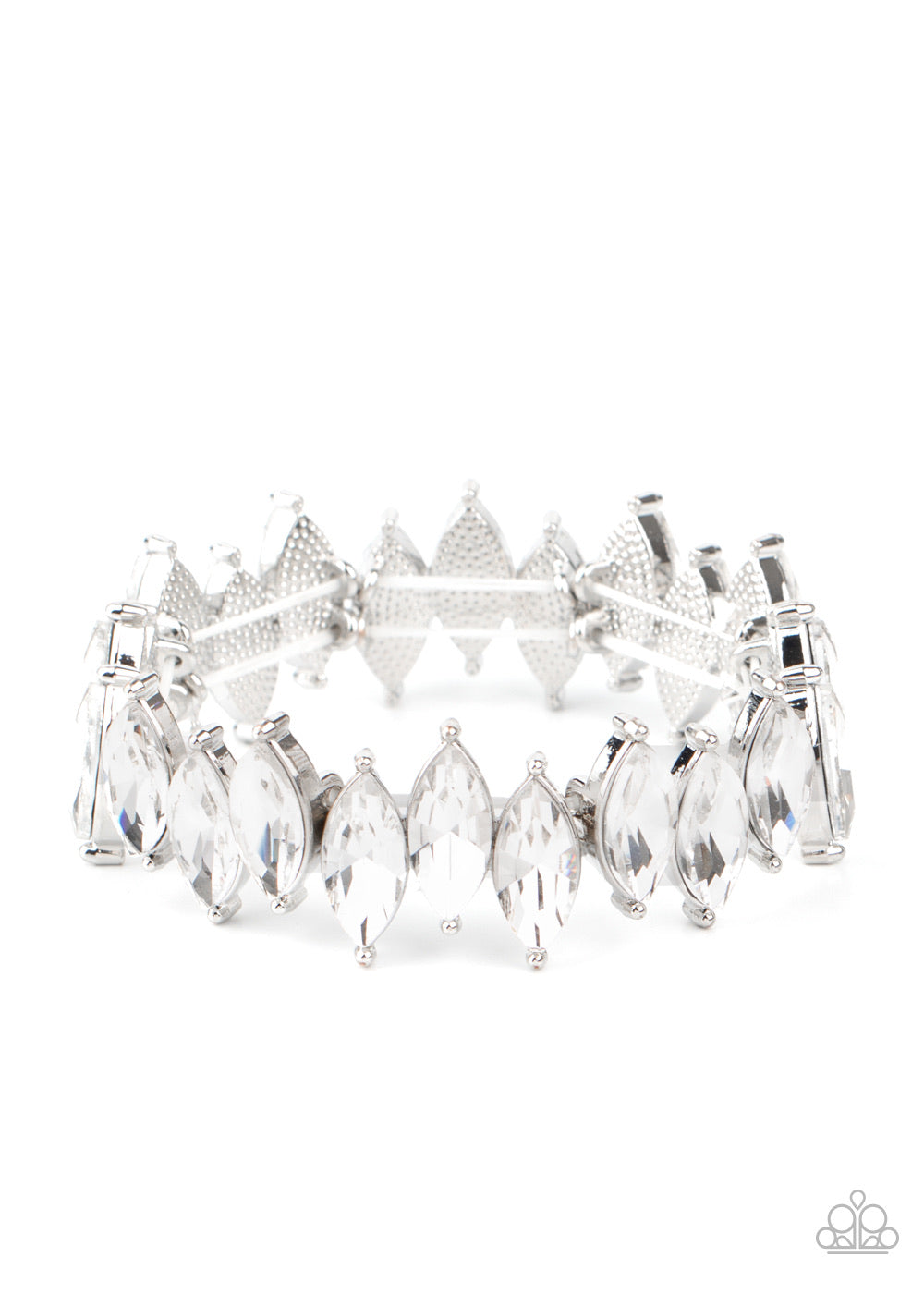 A row of white marquise-cut rhinestones are threaded along stretchy bands and wrapped around the wrist, creating an icy shimmer. The exaggerated points and sharp edges make a bold and dramatic statement