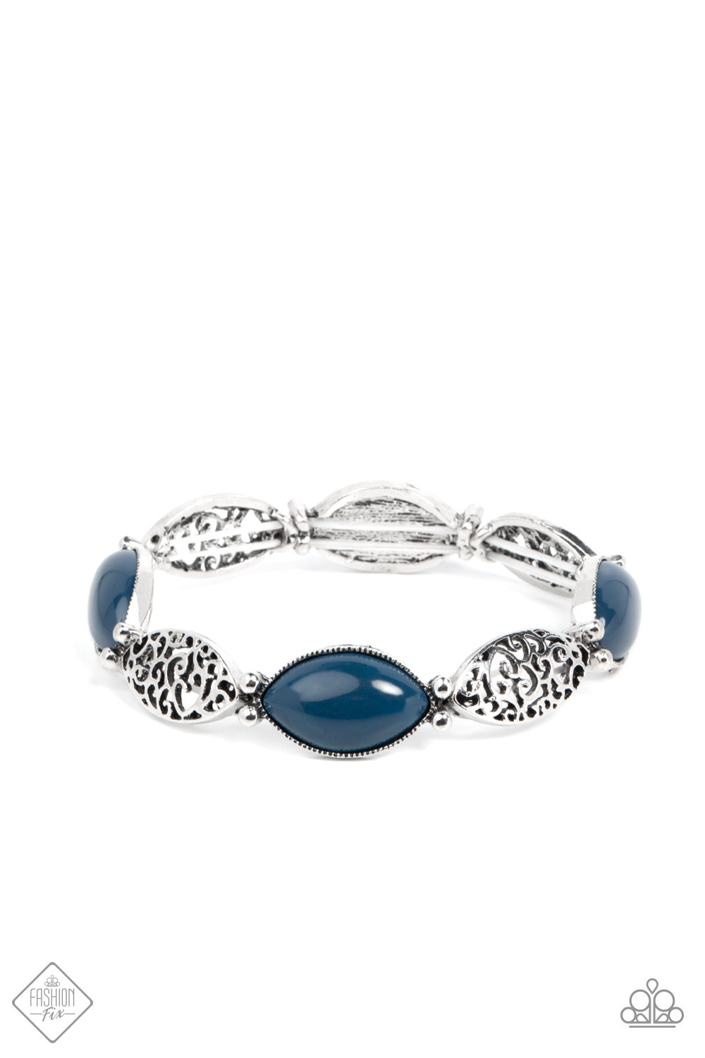 Dewy Navy Blue opals set in daintily studded silver frames mingle with frames of swirling silver filigree as they alternate along stretchy bands for a whimsically wild fashion around the wrist.