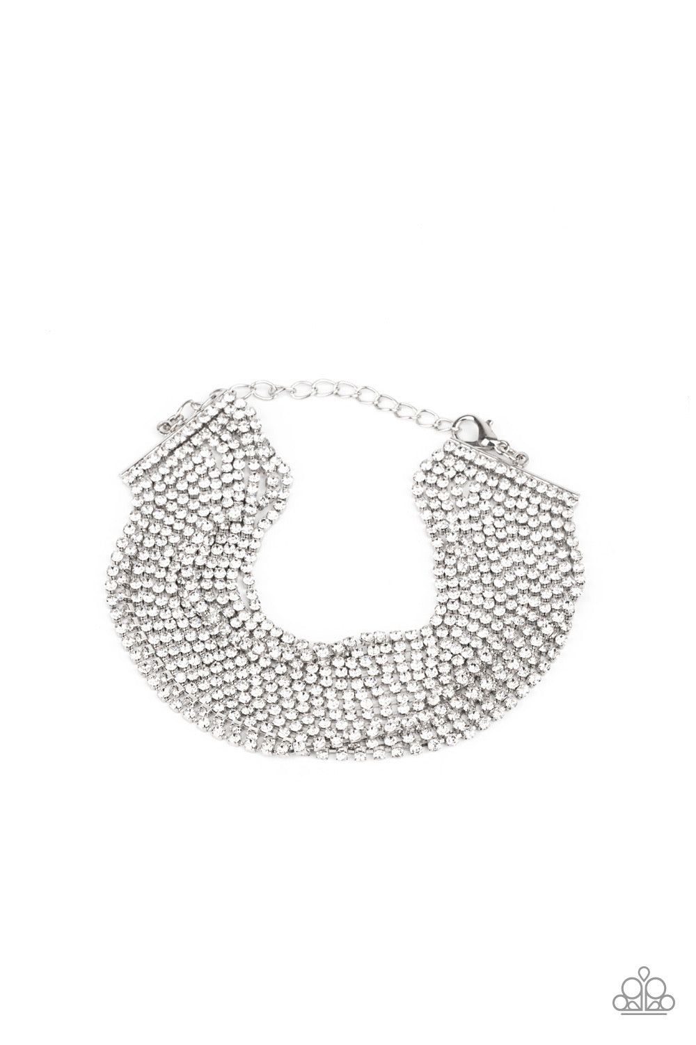 Strung between two silver fittings, sparkly strand after sparkly strand of glittery white rhinestones layer around the wrist, creating a glamorous statement piece. Features an adjustable clasp closure.