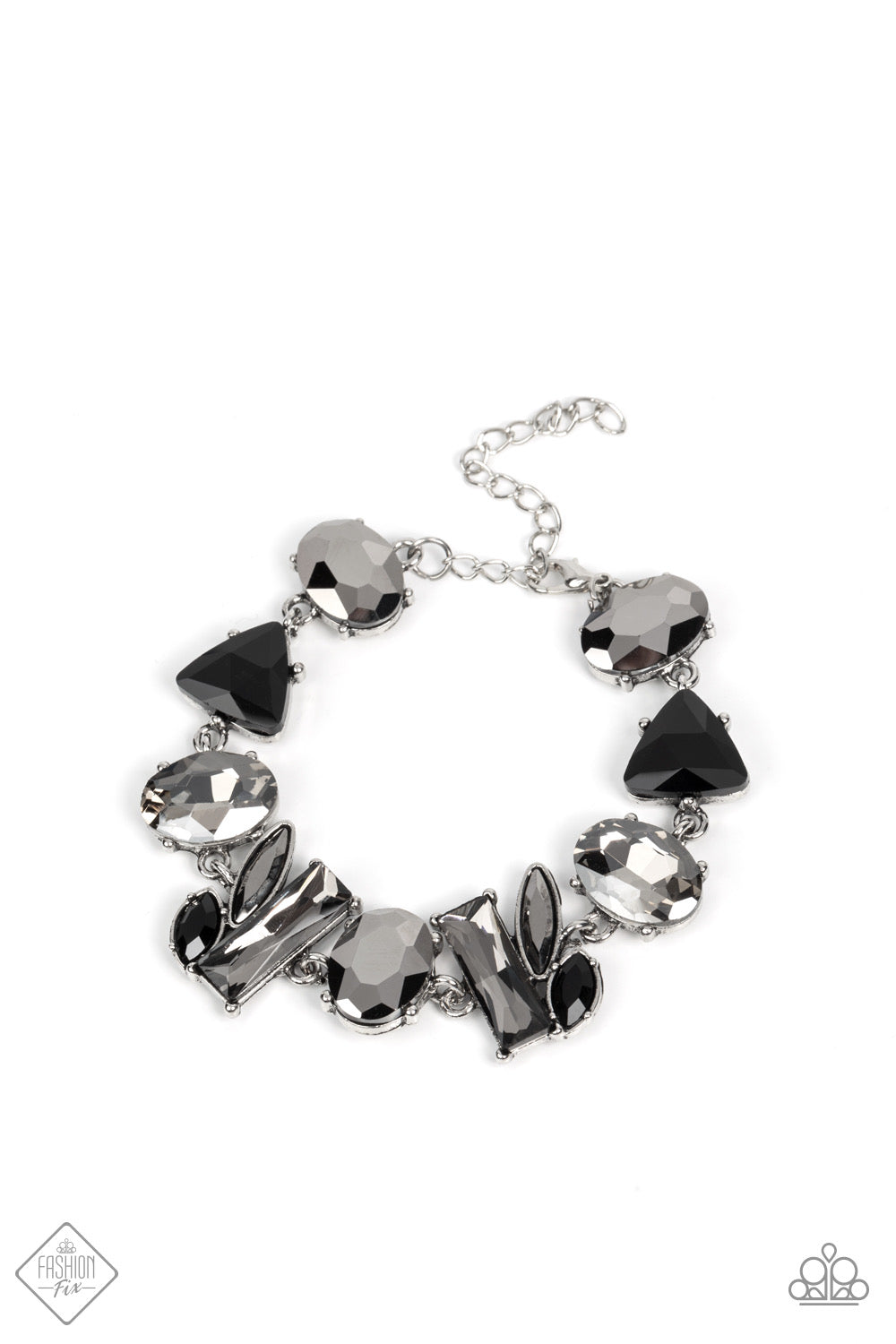 Featuring edgy pronged settings and antiqued silver frames, a mismatched collection of lustrous hematite, smoky, and black rhinestones in various shapes and sizes unite into a gritty modern mashup around the wrist. Features an adjustable clasp closure.