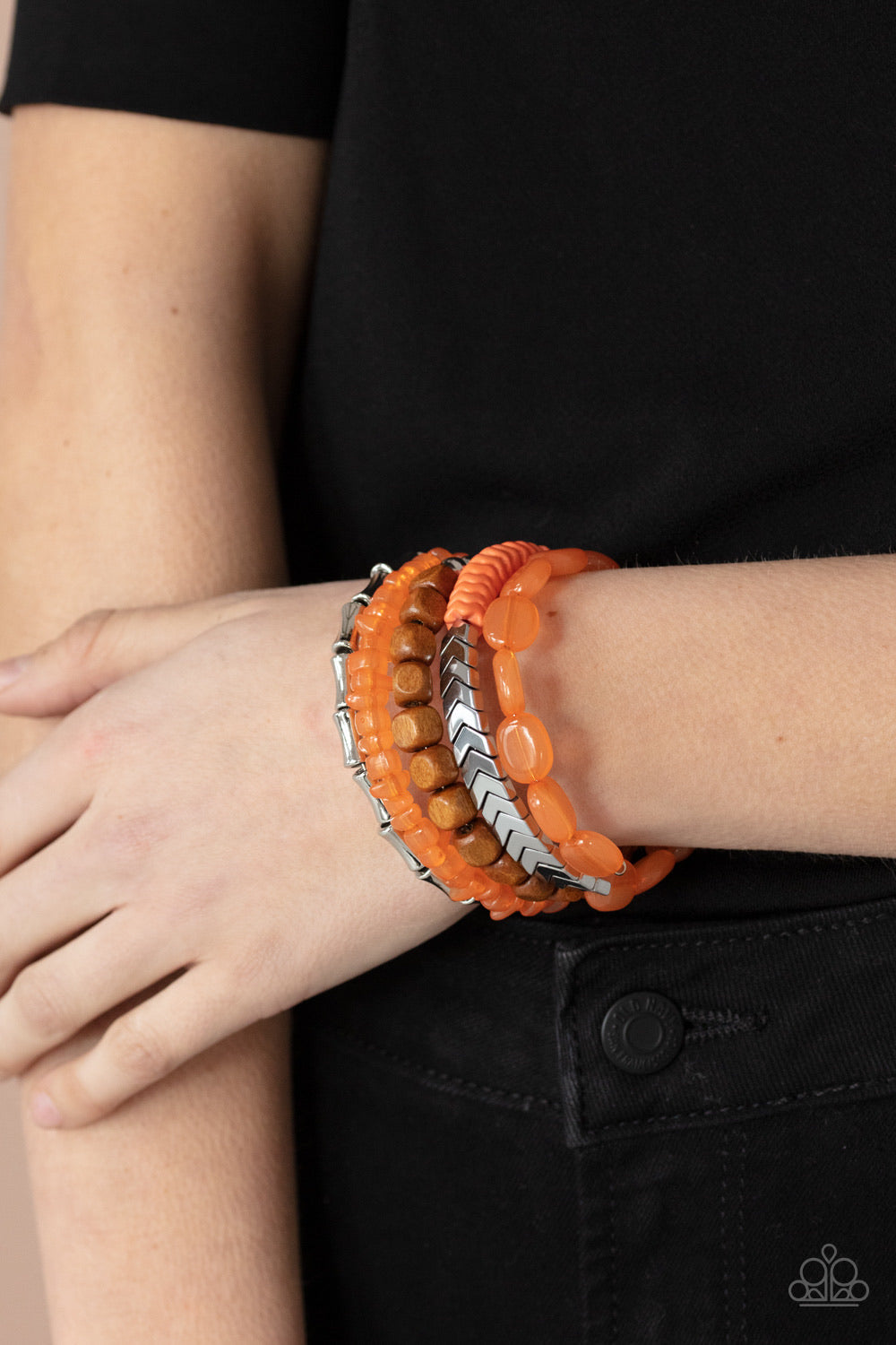 An earthy collection of wooden cubes, glassy orange acrylic ovals, wavy orange accents, tranquil orange pebble-like accents, classic silver beads and silver chevron frames are threaded along a long wire to create a whimsical infinity wrap bracelet around the wrist