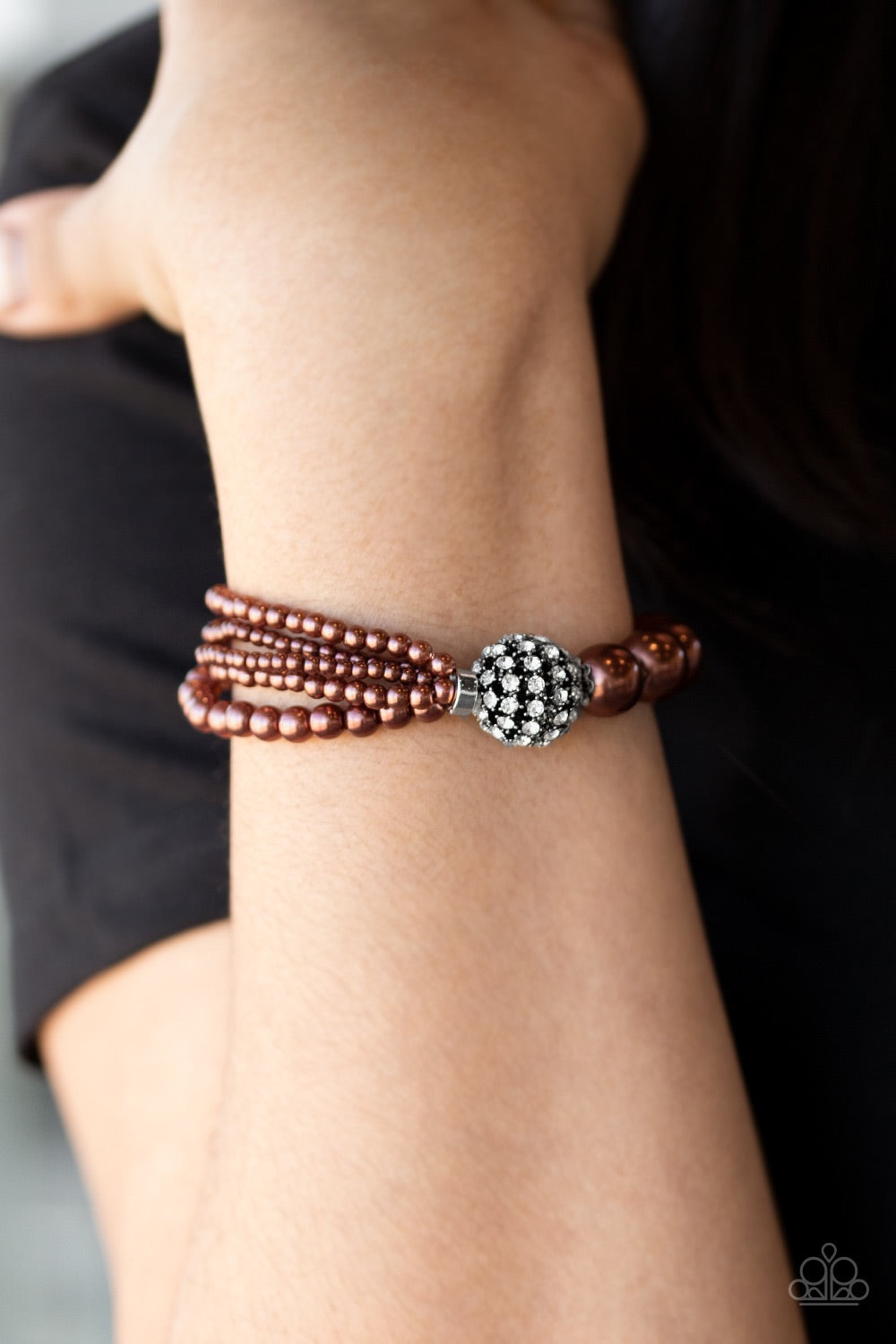 Featuring stretchy bands, a white rhinestone encrusted silver bead joins together strands of mismatched brown pearls and a single strand of classic brown pearls around the wrist for a timeless twist