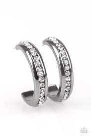 A row of glassy white rhinestones is encrusted down the spine of a shiny silver hoop for a refined look. Earring attaches to a standard post fitting. Hoop measures 1 1/4" in diameter.