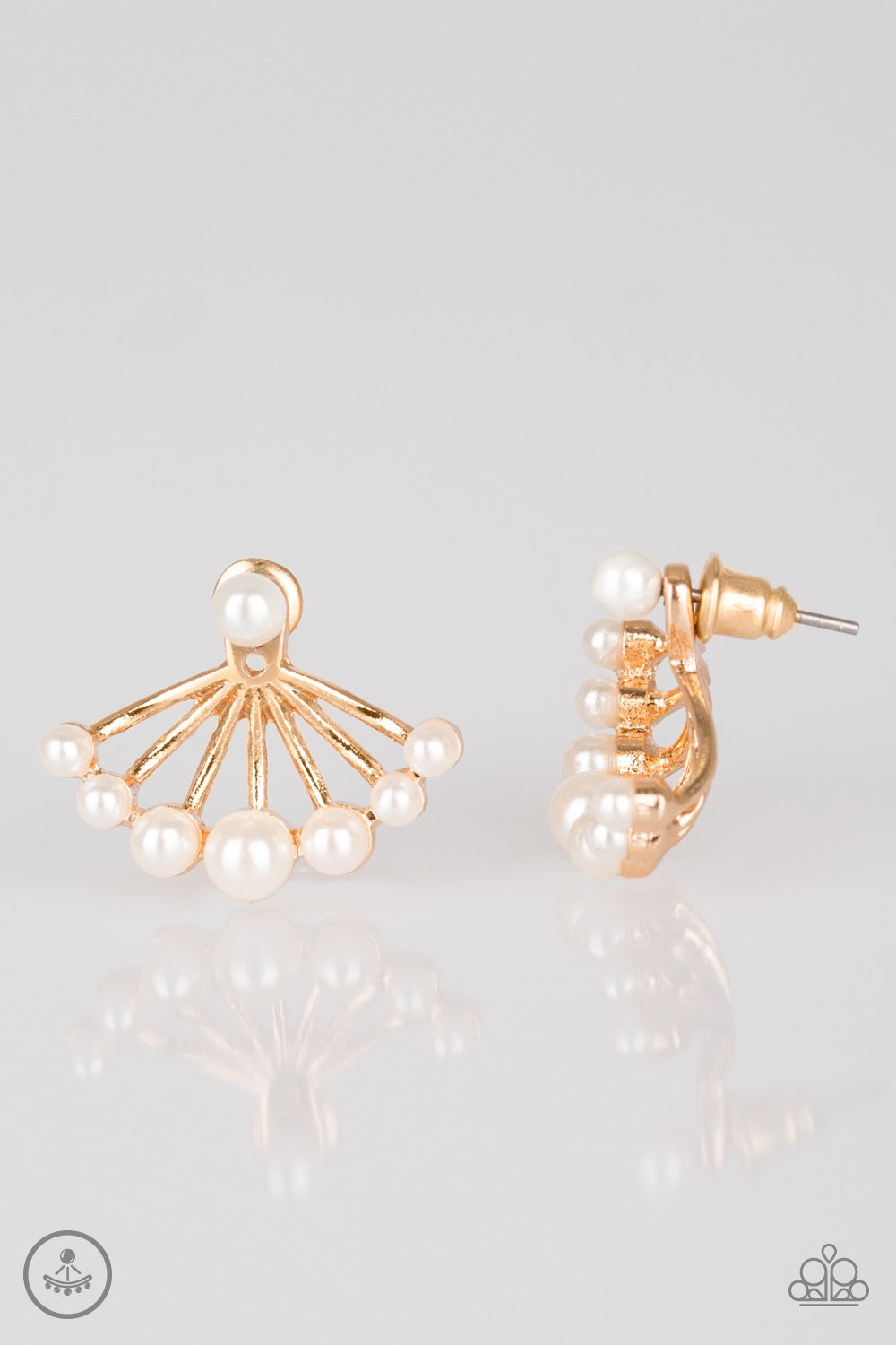 A dainty white pearl attaches to a double sided post, designed to fasten behind the ear. Brushed in a high sheen shimmer, the pearl encrusted double sided post peeks out beneath the ear for refined look. Earring attaches to a standard post fitting.