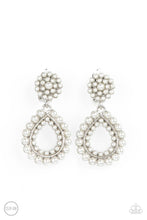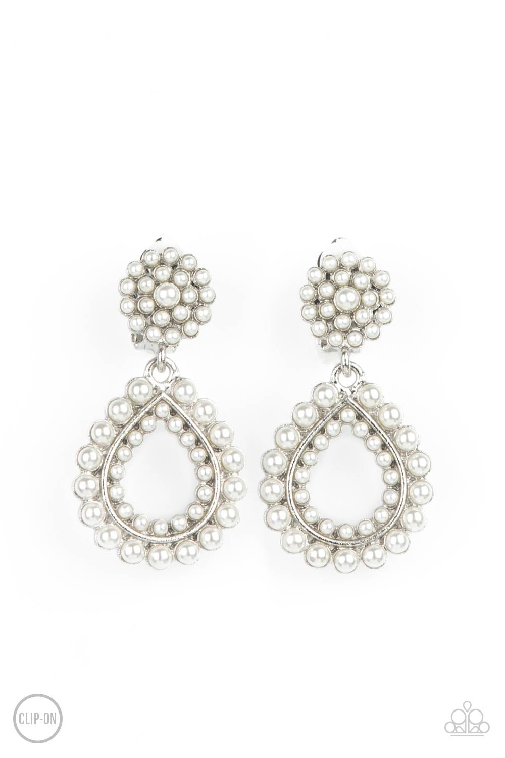 Droplets of pearls dot the surface of a silver teardrop frame that suspends from a round pearl encrusted disc for a classic finish. Earring attaches to a standard clip-on fitting.