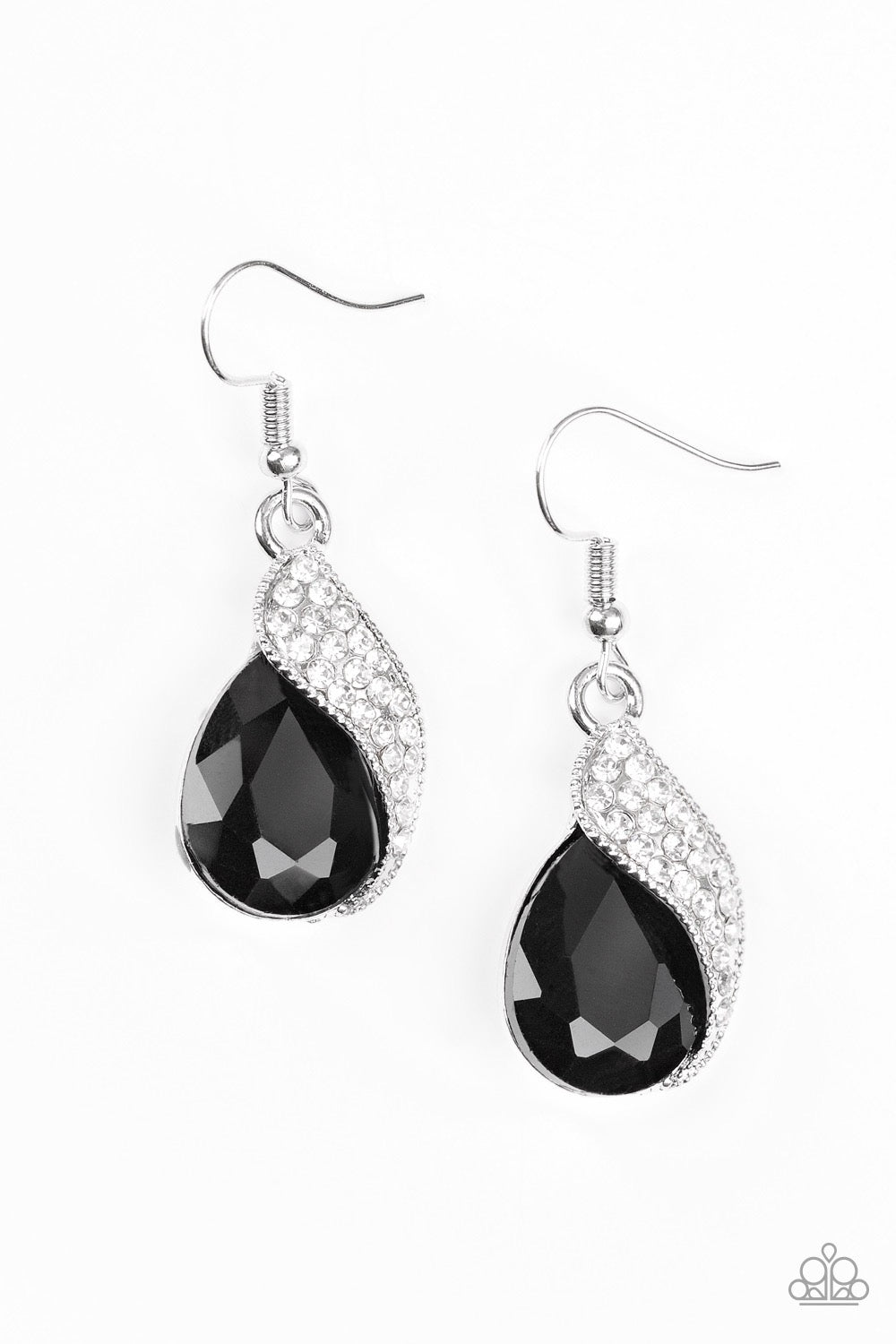 Encrusted in glittery white rhinestones, a shimmery silver ribbon wraps around a faceted black teardrop gem for a timeless look. Earring attaches to a standard fishhook fitting.