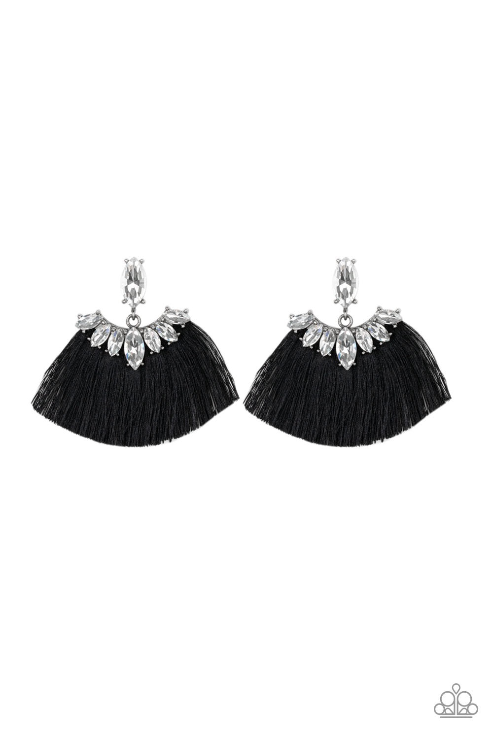 A solitaire marquise cut rhinestone gives way to a plume of shiny black thread crowned in a matching rhinestone encrusted fringe for a glamorous look. Earring attaches to a standard post fitting.