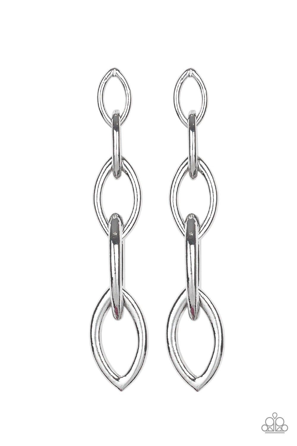 Featuring a high-sheen finish, glistening silver links gradually increase in size as they trickle from the ear for an edgy look.