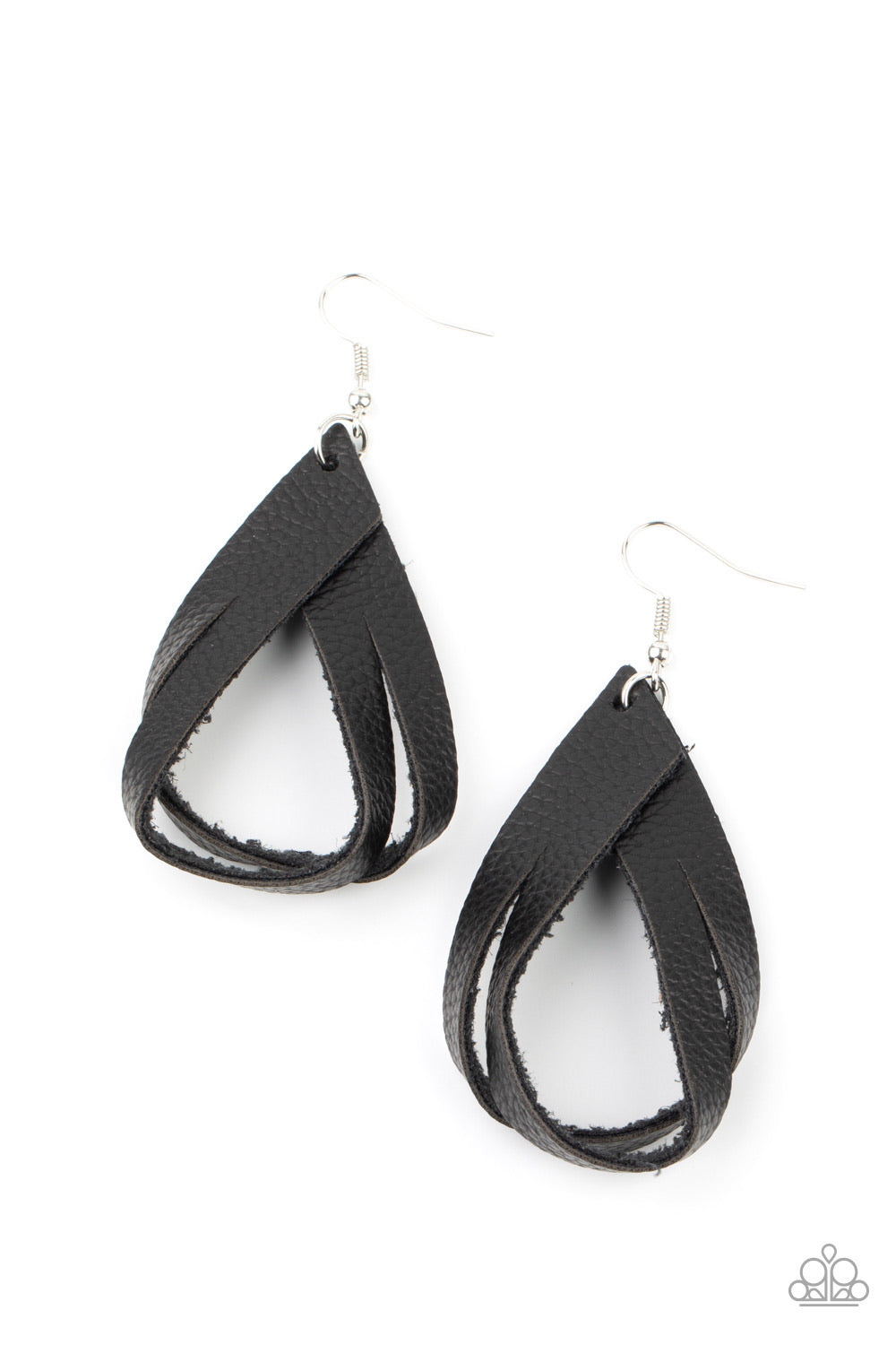 A piece of rustic black leather is spliced into strands that delicately loop into an earthy frame. Earring attaches to a standard fishhook fitting.