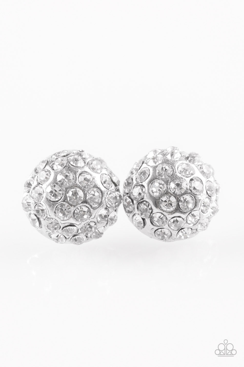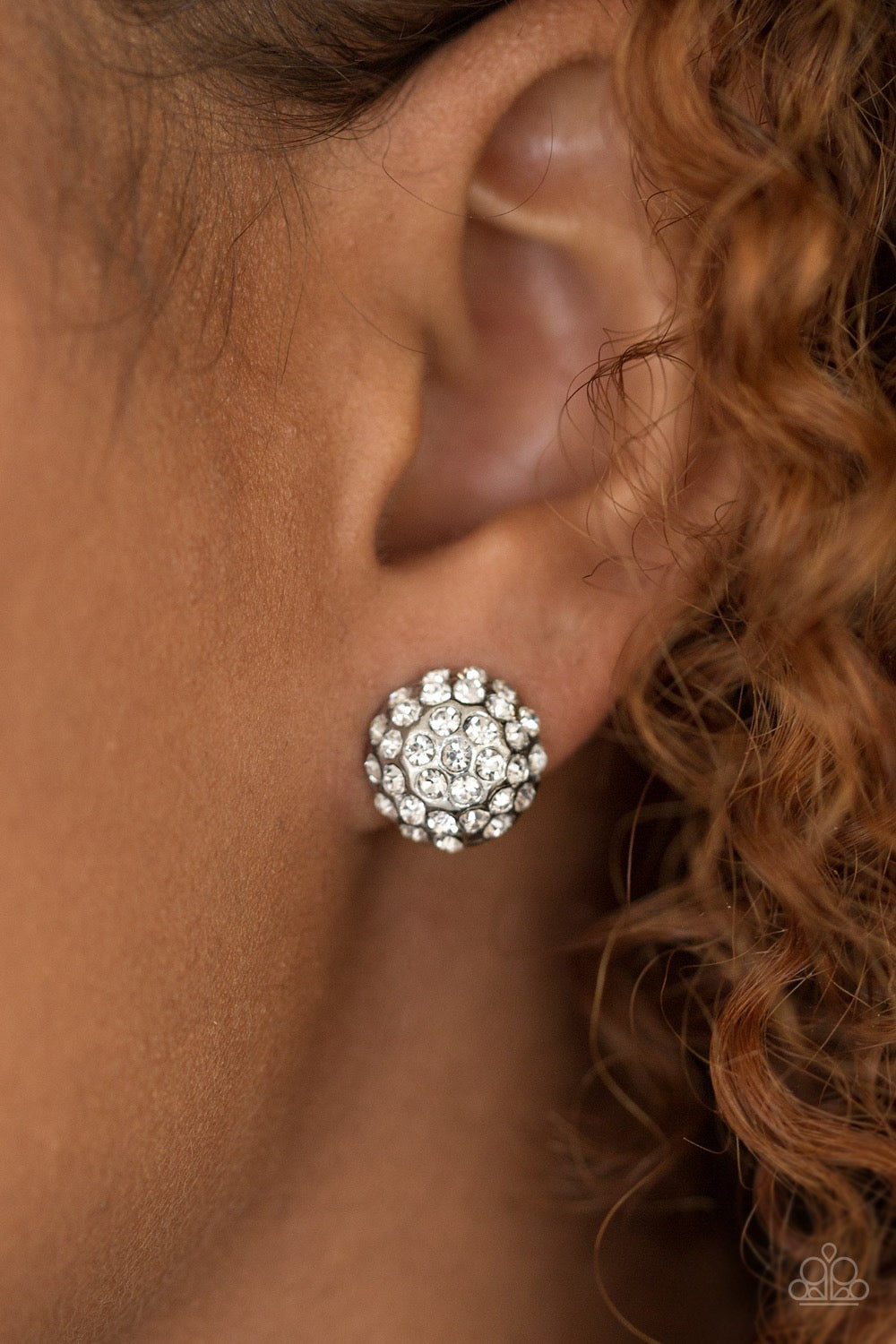 A beveled silver frame is encrusted in glittery white rhinestones, creating blinding shimmer. Earring attaches to a standard post fitting.