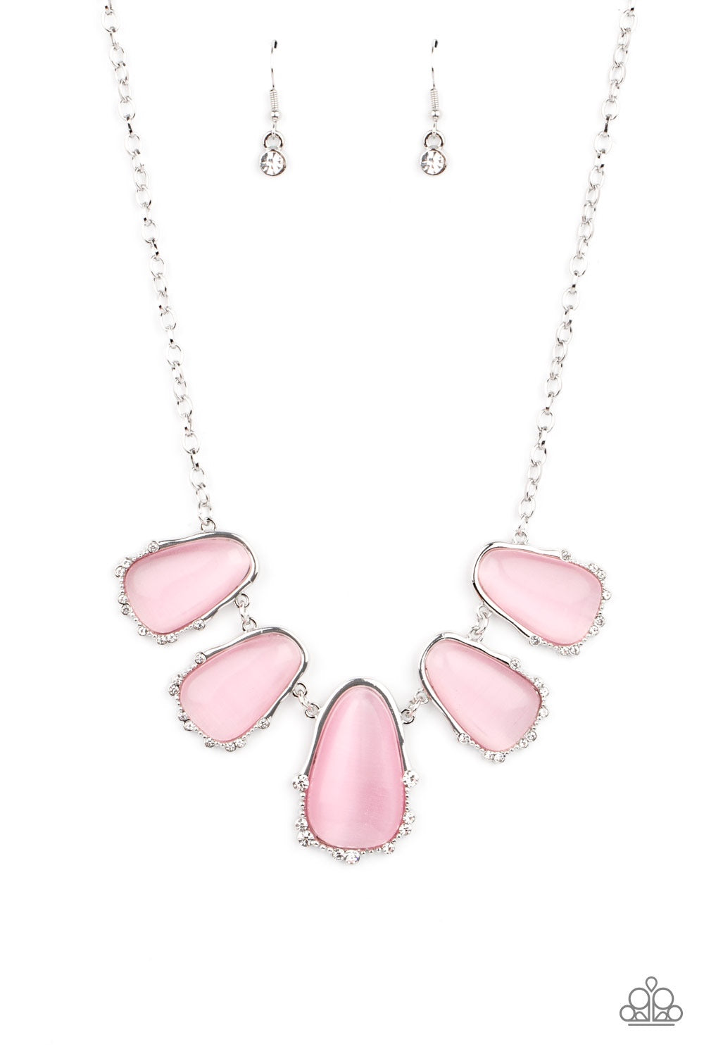 A collection of asymmetrical pink cat’s eye stone teardrops are encased inside imperfect silver frames as they delicately link below the collar. The dainty silver frames are sporadically dotted in dainty silver studs and glassy white rhinestones, adding delicate sparkle to the ethereal display. Features an adjustable clasp closure.