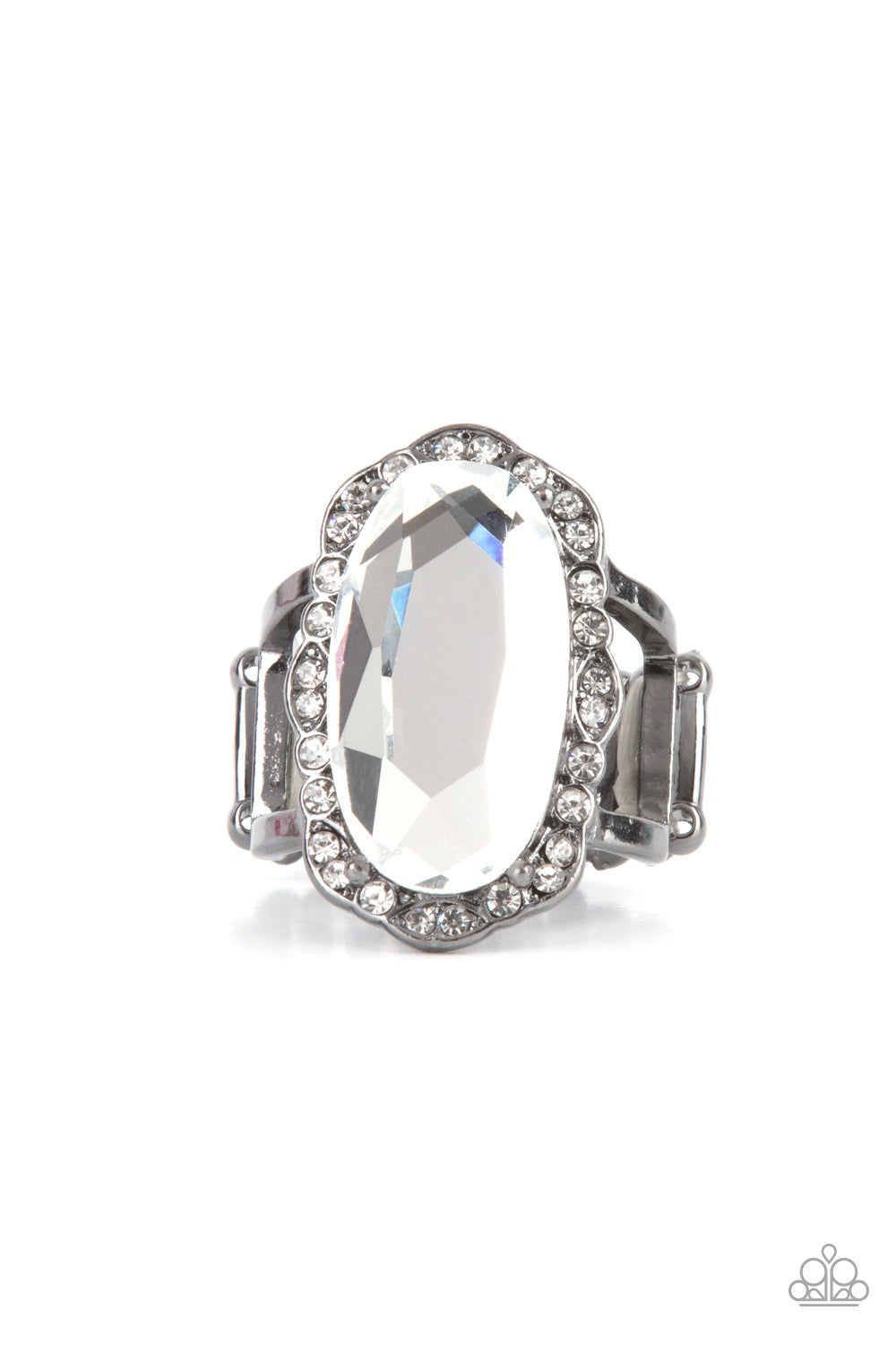 A dramatically oversized oval white gem adorns the center of a scalloped gunmetal frame dusted in dainty white rhinestones, creating a commanding centerpiece atop the finger. Features a stretchy band for a flexible fit.