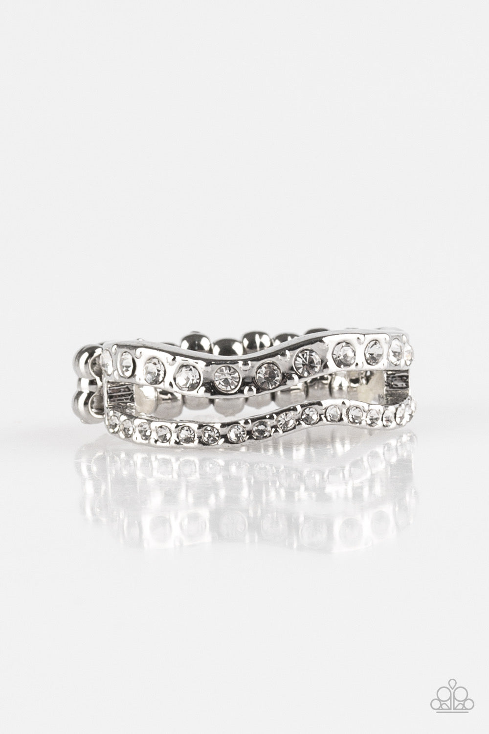 Varying in size, glittery white rhinestones are encrusted along waving silver bands for a refined look. Features a dainty stretchy band for a flexible fit.